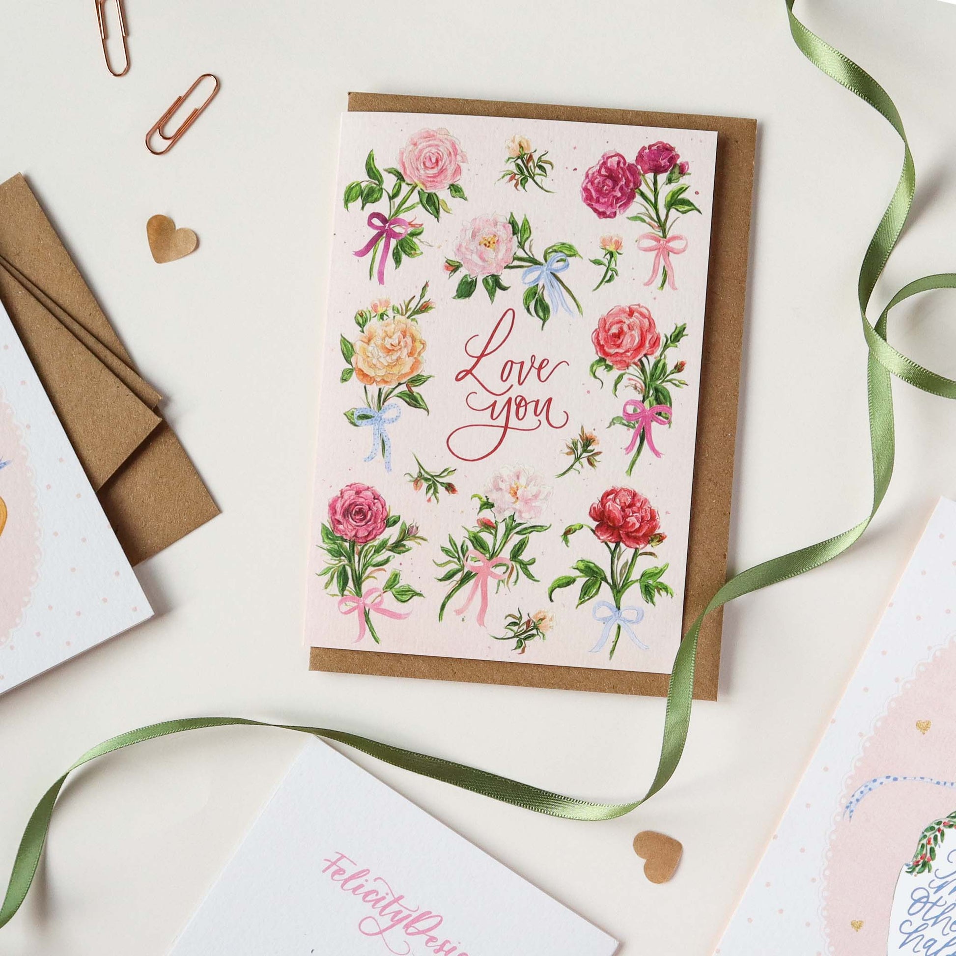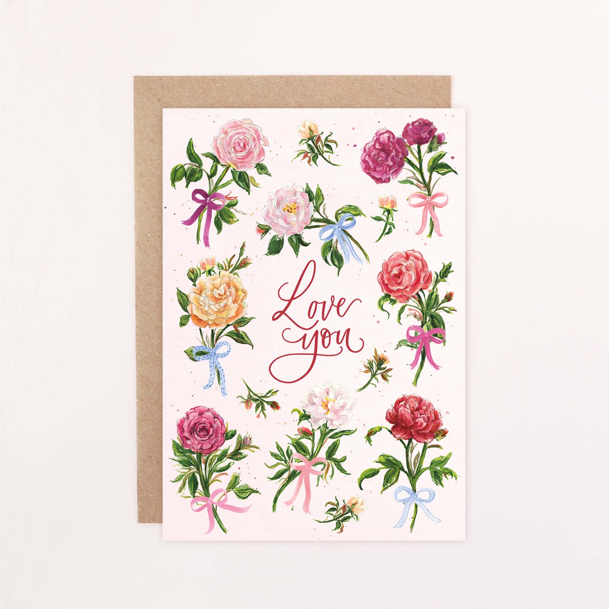 A heartfelt card featuring delicate English garden roses, one of the most charming flowers in any cutting garden, paired with flowing coloured bows. All lettering is hand illustrated for that unique touch. A perfect choice for anniversaries, special dates or just because.