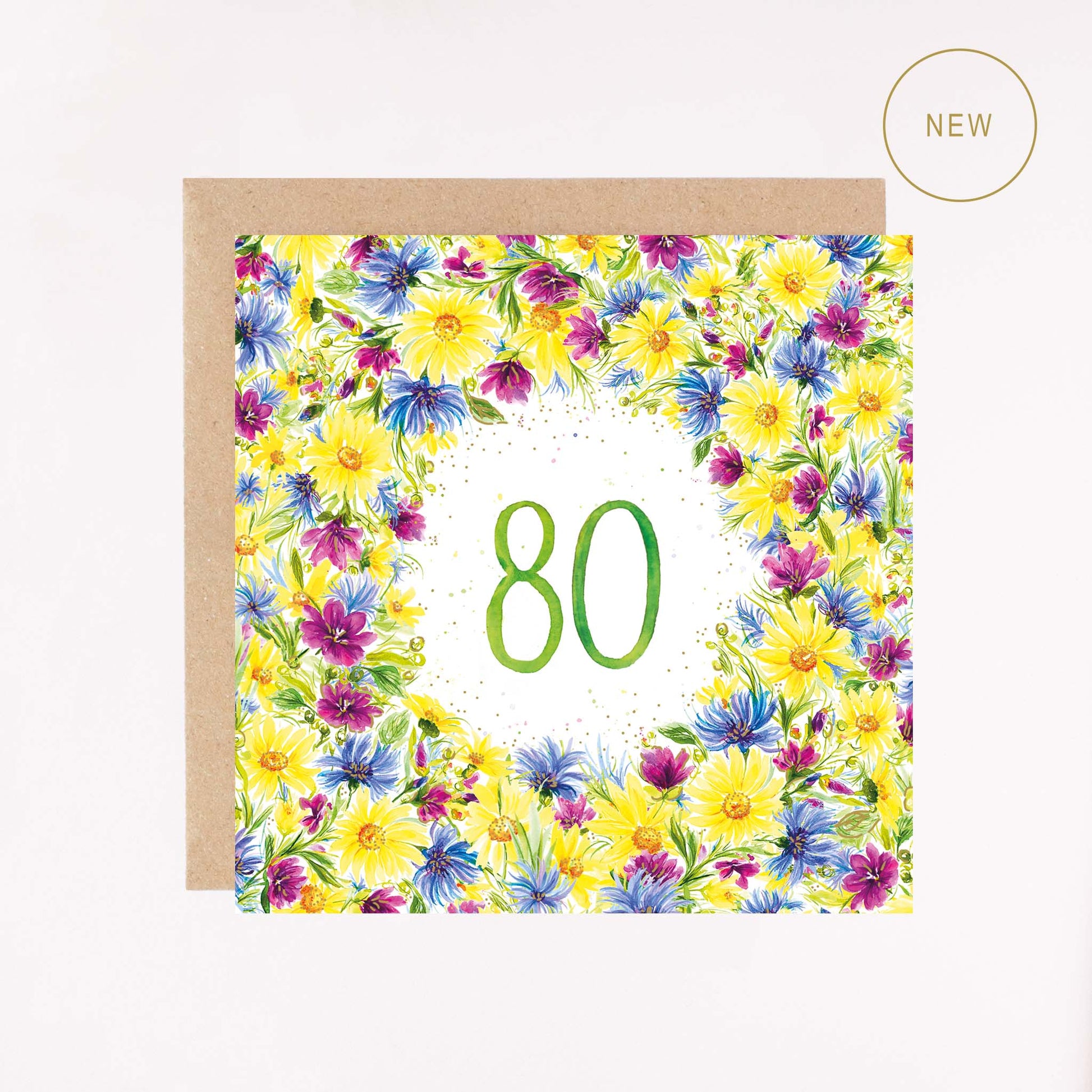 Send a special birthday wish with our hand-illustrated and hand-lettered, age 80 foil floral wreath greetings card. Inspired by vibrant wild summer flowers, each card features a milestone birthday number and includes elements of foiled gold in the design.